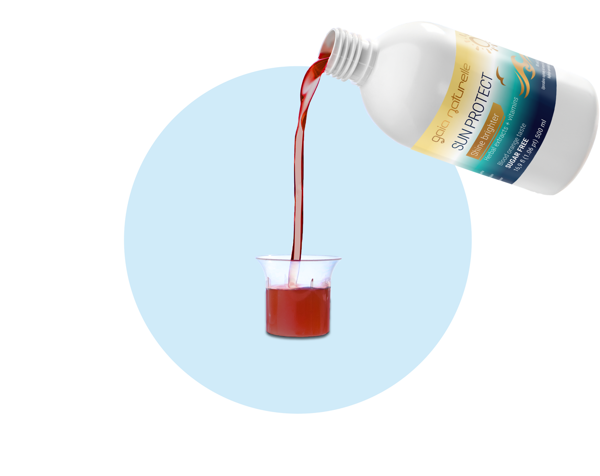 Water; sweetener: xylitol; tropical fern root extract (Polypodium leucotomos); vitamin C (L-ascorbic acid); stabilisers: xanthan gum, gellan gum; acid: citric acid; red orange fruit extract (Citrus sinensis); flavour; preservative: potassium sorbate, vitamin E (alpha-tocopheryl acetate); vitamin A (retinyl palmitate); sweetener: sucralose, vitamin D3 (cholecalciferol).