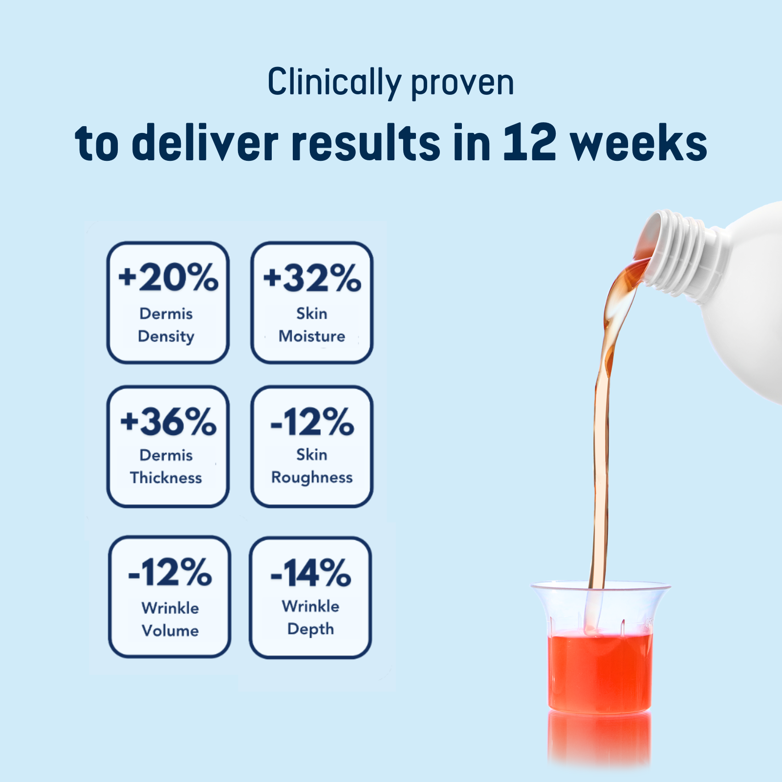Our independent double-blind study confirms that the unique formulation of our Collagen Shot, featuring 5,000 mg of hydrolyzed marine collagen, significantly improves skin quality.